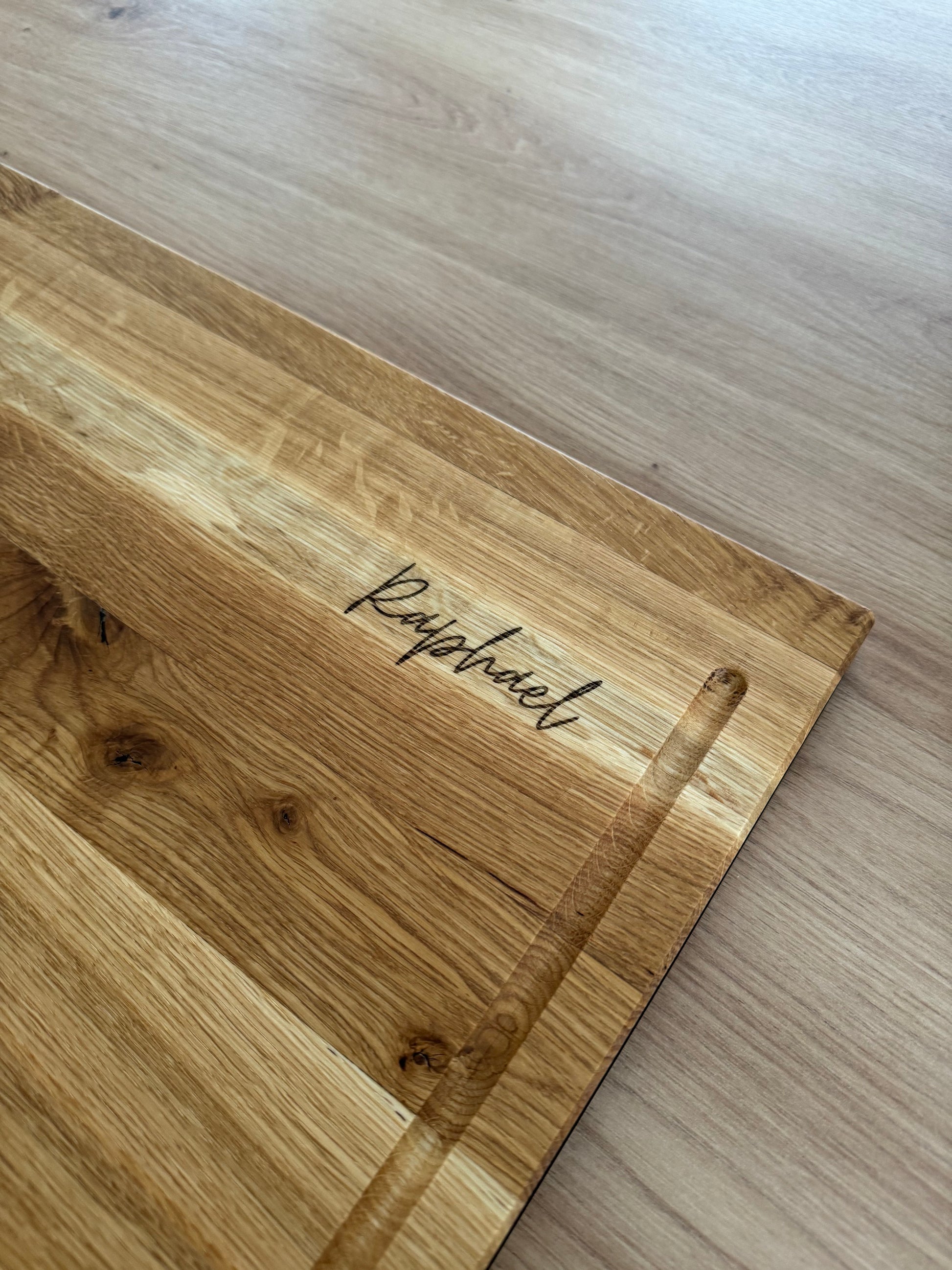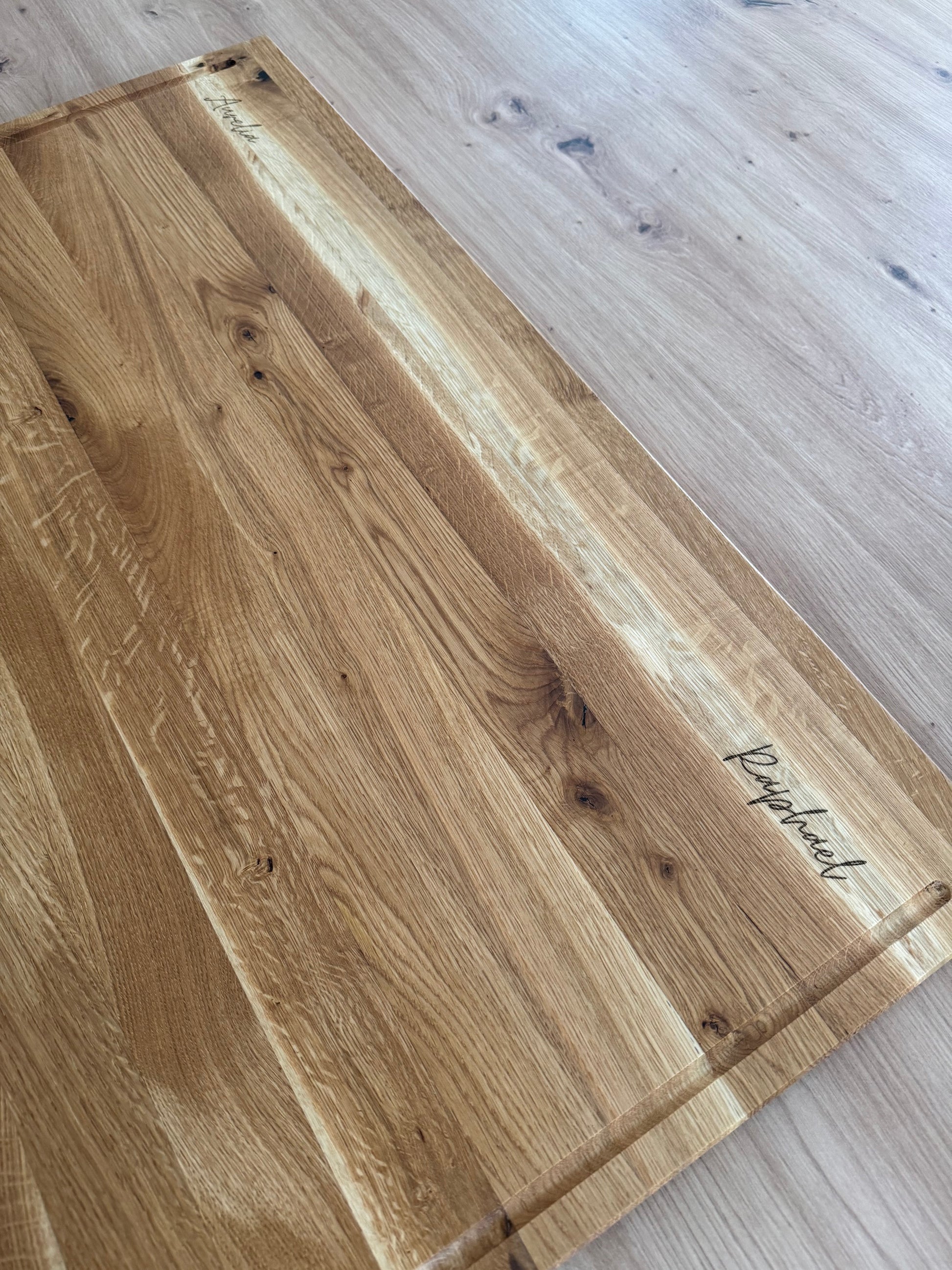 Es handelt sich um geöltes Eichenholz. Du solltest stehendes Wasser auf dem Holz vermeiden. Ansonsten kann das Brett nach Benutzung feucht abgerieben werden.